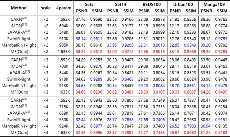 표 1은 PSNR 및 SSIM 기준 IMF와 기존 방식들의 성능을 비교한 결과로, 모든 스케일(2배, 3배, 4배) 및 데이터셋에서 IMF가 일관되게 MambaIR[11]을 상회하였다. 특히 Urban100 데이터셋의 4배율에서, IMF는 PSNR이 최대 0.35dB, SSIM 기준 0.0097의 성능 향상을 기록하며 고주파 텍스처 재현 측면에서의 강점을 확인하였다.
