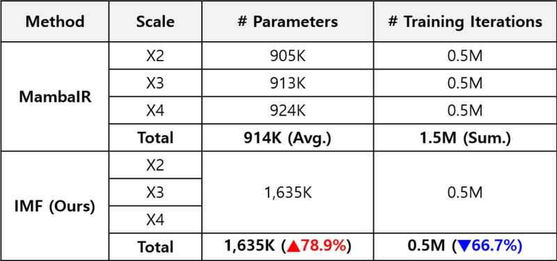 IMF는 FSSB 및 INR 구조를 포함함에 따라 총 파라미터 수는 약 78.9% 증가한 1,635K이지만, 모든 배율(2배, 3배, 4배)을 단일 학습으로 처리할 수 있어, 기존 MambaIR이 각 배율마다 50만 회 반복(총 1.5M)을 요구하던 것과 달리 총 50만 회만으로 전체 스케일을 학습한다. 이에 따라 학습 반복 횟수 기준 66.7%의 절감 효과가 발생하며, 결과적으로 전체 학습 비용은 오히려 감소하였다(표 2 참조). 이는 학습 시간과 계산 자원 측면에서의 효율성과 실용성 측면에서 매우 유리한 구조임을 나타낸다.