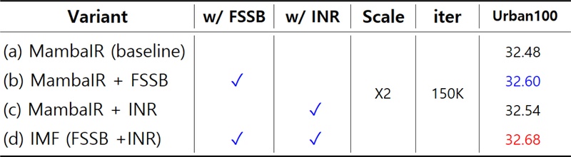IMF는 다음의 두 가지 구조적 개선을 통해 기존 MambaIR 기반 SR 구조의 한계를 효과적으로 확장한다.