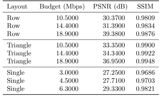 [표 1]과 [그림 8]은 예산에 따른 PSNR(Peak Signal-to-Noise Ratio), SSIM(Structural Similarity Index) 값을 나타낸 표와 예산에 따른 PSNR, SSIM의 개형을 나타낸 것이다. 레이아웃은 일렬(Row), 삼각형(Triangle), 단일(Single) 세 가지로 구성하였다. 다양한 레이아웃(Row, Triangle, Single)에 대해 PSNR과 SSIM을 측정한 결과, 평균 SSIM이 0.9 이상으로 유지되었으며, 27Mbps 대비 약 60% 낮은 10.5Mbps에서도 시각적 품질 저하가 거의 발생하지 않았다. 이를 통해 제안 시스템이 제한된 대역폭 환경에서도 높은 QoE를 유지함을 확인하였다.